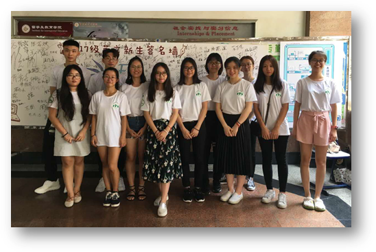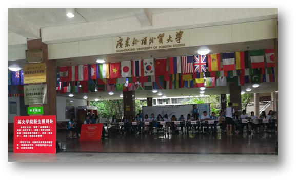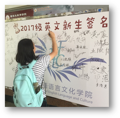 英文学院通过先期策划布置,在报到当日营造了浓郁的学院文化氛围和品牌意识,除了悬挂欢迎横幅和指示牌之外,特意制作了2017级新生签名墙,让每一位报到新生在院徽下写下姓名,树立起成为“英文人”的共识,彰显学院“家”文化的温馨氛围。