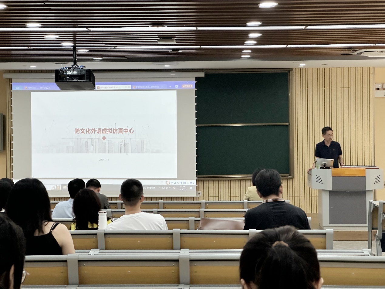 会上,学院郑常青博士就跨文化外语虚拟仿真中心实验室的基本情况、建设设想和使用方向进行汇报。跨文化外语虚拟仿真中心实验室将依托国家级一流课程、AI+外语教育教学系以及产学研的融合,开拓虚拟仿真实验实践平台,回应新文科大背景下的时代需求。