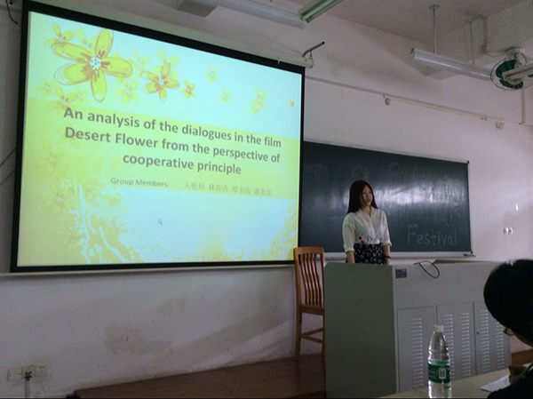 语言学班小组随后登场。他们从合作原则的角度分析了“沙漠之花”这部影片中的对话。对于他们的展示,嘉宾老师Bamberg认为,把理论当做圣经一样是不明智的;同学们应更多地发表自己的理解和看法,并可以从多方面去挖掘影片信息。这些意见让小组成员们获益匪浅。