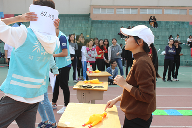 首先开始的项目是“趣味接力之西天取经”。各队选手在这一项目中都展现出了极强的团队合作能力,成功地克服了游戏过程中出现的眩晕、失衡、目不能视等“九九八十一难”,最终完成了挑战。其中,来自1713班的“什么都队”凭借出色的技巧拔得头筹,赢得观众们的一致喝彩。