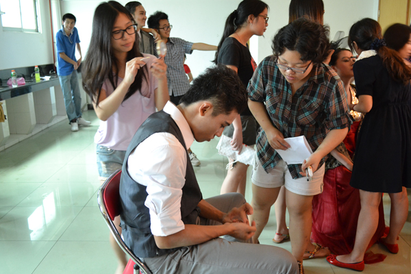 本网讯 5月23日下午,英文学院第15届戏剧大赛的四个剧组在云山会堂进行了第二次彩排。外教Duncan、Margaret和英文学院的多位老师到场观看并指导。